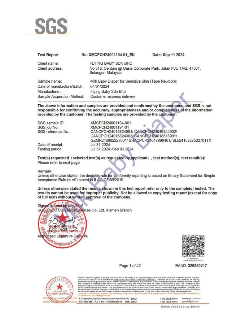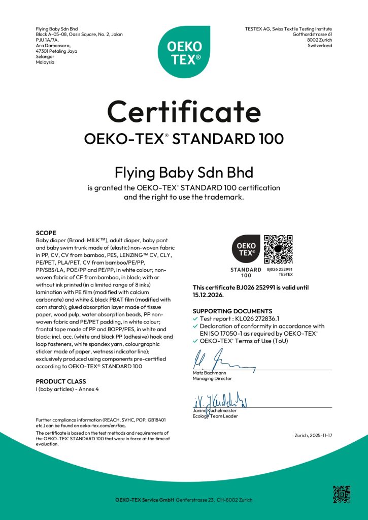 MILK™ diapers have proudly earned the prestigious OEKO-TEX® Standard 100 certification (Product Class I: Babies and small children up to 3 years), safeguarding your baby from numerous harmful substances. This rigorous testing ensures compliance with EU REACH regulations and the American Consumer Product Safety Commission (CPSC) standards.